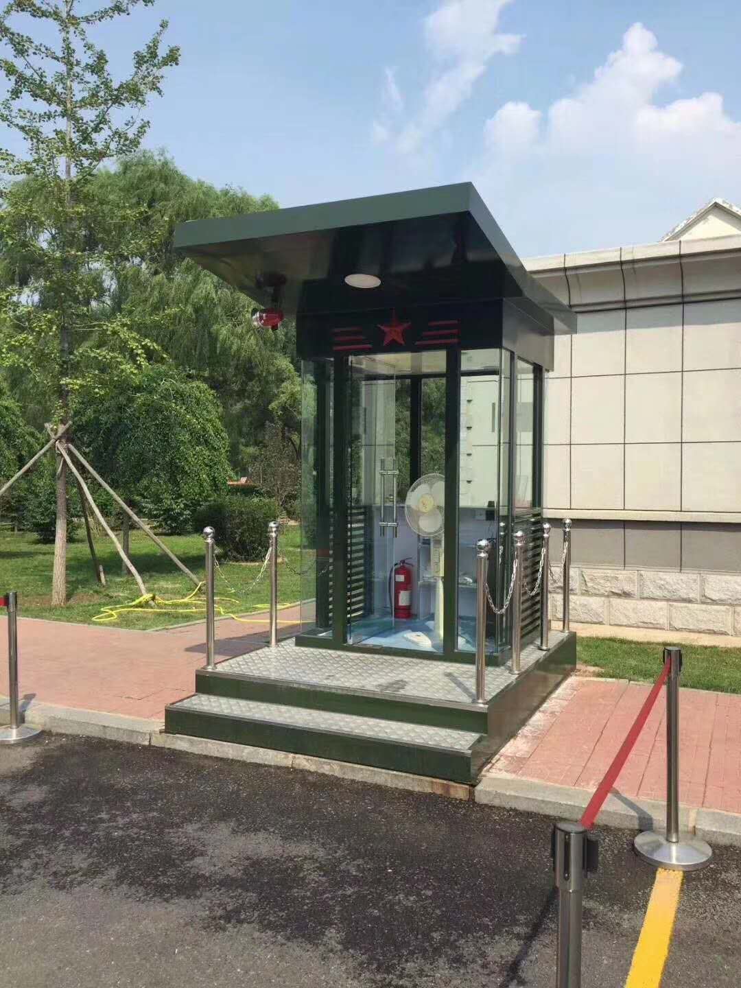 值班崗亭的主要龍骨為鋼結構龍骨,起尺寸為40x60x1.5mm鍍鋅龍骨;立柱一般為堅固耐用的型鋼,尺寸規格有80x80x2.0mm,40x80x2.0mm等等,可根據產品的大小不同而來決定立柱的大小;玻璃一般為8mm鋼化玻璃,具有較強的抗沖擊力,即使破碎也不會傷到人;地板為3mm防滑鋼板,鋪紅色地毯,四周可用鈦金立柱和紅絨繩作為裝飾件,使產品看起來更美觀,大氣,高檔。